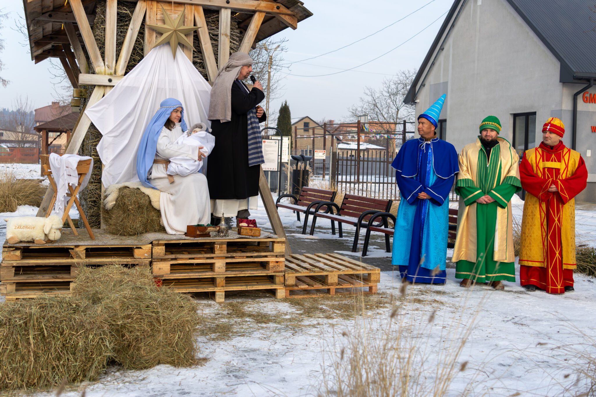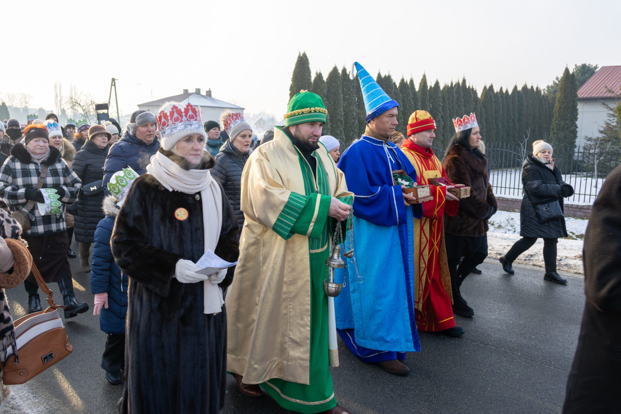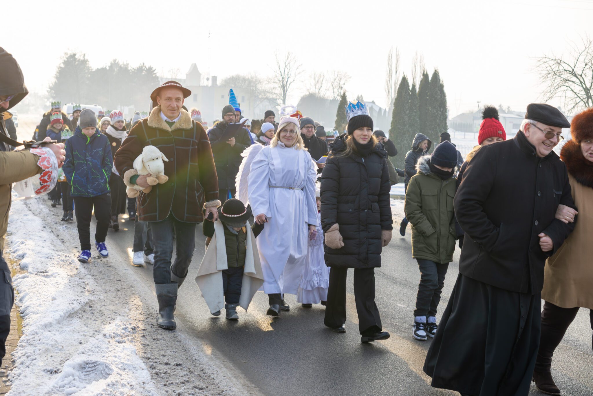 W barwnej procesji, pełnej śpiewu kolęd i symbolicznych rekwizytów wzięli udział mieszkańcy wraz z Trzema Królami, aniołami, pastuszkami, dziećmi, młodzieżą oraz przedstawicielami władz samorządowych Wójt Gminy Moniką Pietrzyk, Sekretarz Anną Sobieraj, radnymi dyrektorem GOK Albertem Szułczyńskim i dyrektor biblioteki Ewą Trojanowską. Całości towarzyszyła wyjątkowa, radosna i wspólnotowa atmosfera. Zwieńczeniem przemarszu było dotarcie pod tężnię, gdzie przygotowano stajenkę. To właśnie tam Trzej Królowie oddali pokłon Dzieciątku Jezus, składając symboliczne dary i podkreślając istotę święta Objawienia Pańskiego. Chwila ta stanowiła centralny punkt uroczystości i zgromadziła licznych uczestników wokół betlejemskiej sceny. Podczas pobytu przy stajence uczestnicy mogli także obejrzeć występ taneczny dzieci przygotowujących się do sakramentu bierzmowania, który spotkał się z dużym zainteresowaniem i ciepłym przyjęciem publiczności.