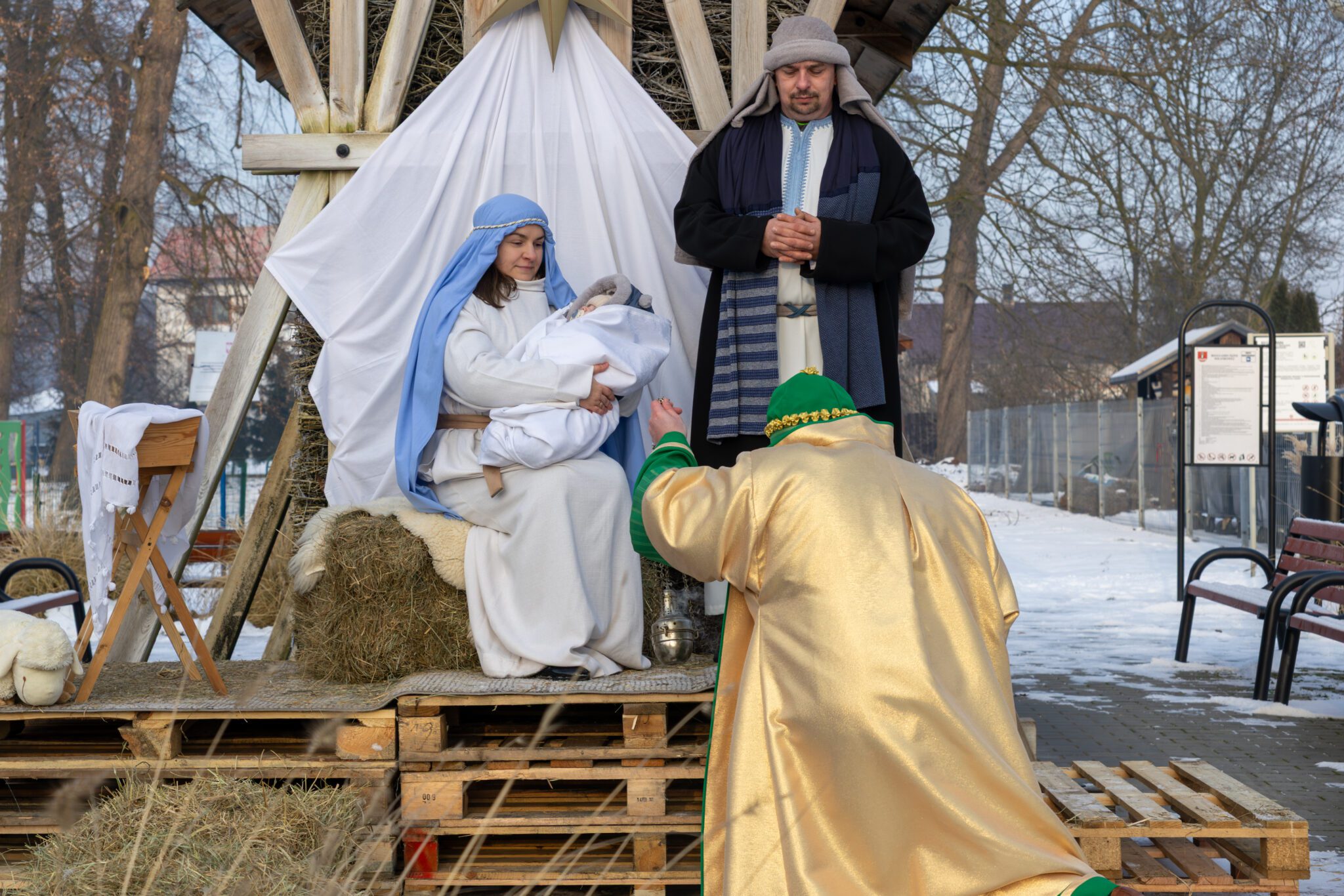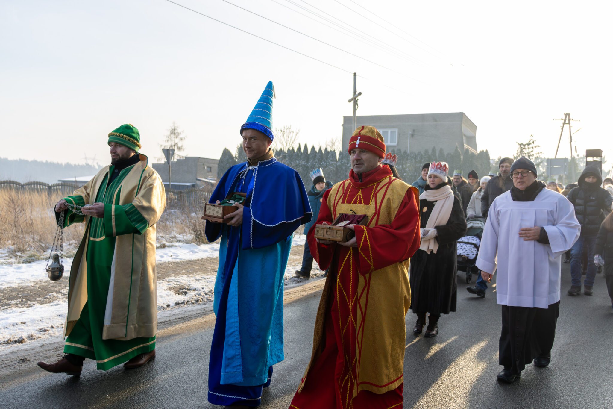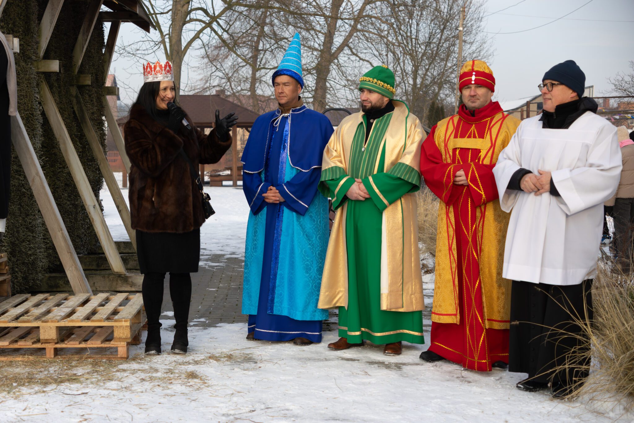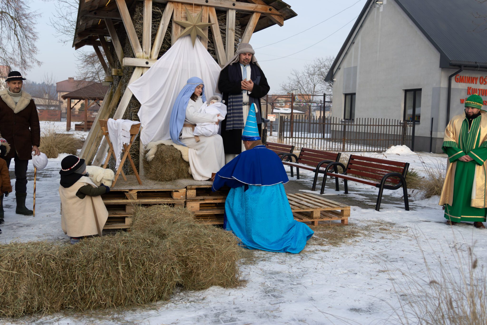 W barwnej procesji, pełnej śpiewu kolęd i symbolicznych rekwizytów wzięli udział mieszkańcy wraz z Trzema Królami, aniołami, pastuszkami, dziećmi, młodzieżą oraz przedstawicielami władz samorządowych Wójt Gminy Moniką Pietrzyk, Sekretarz Anną Sobieraj, radnymi dyrektorem GOK Albertem Szułczyńskim i dyrektor biblioteki Ewą Trojanowską. Całości towarzyszyła wyjątkowa, radosna i wspólnotowa atmosfera. Zwieńczeniem przemarszu było dotarcie pod tężnię, gdzie przygotowano stajenkę. To właśnie tam Trzej Królowie oddali pokłon Dzieciątku Jezus, składając symboliczne dary i podkreślając istotę święta Objawienia Pańskiego. Chwila ta stanowiła centralny punkt uroczystości i zgromadziła licznych uczestników wokół betlejemskiej sceny. Podczas pobytu przy stajence uczestnicy mogli także obejrzeć występ taneczny dzieci przygotowujących się do sakramentu bierzmowania, który spotkał się z dużym zainteresowaniem i ciepłym przyjęciem publiczności.