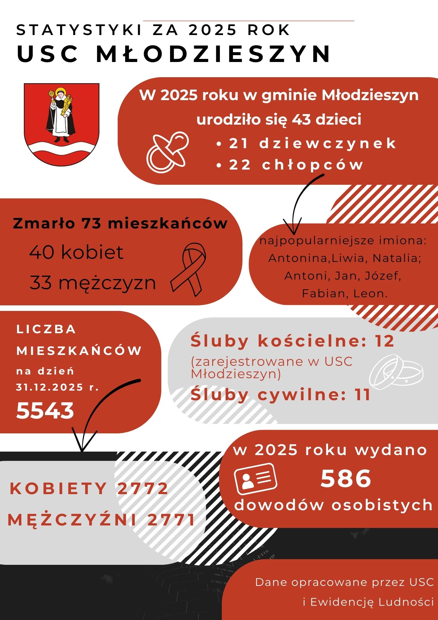 Pomimo wzrostu liczby ludności w gminie w porównaniu do roku 2024, rok 2025 to rok niżu demograficznego w gminie Młodzieszyn ponieważ zmarło więcej osób niż się urodziło. Urodziło się 43 dzieci – o 8 mniej niż w roku poprzednim. Zmarły 73 osoby – o 15 osób więcej niż w roku poprzednim.