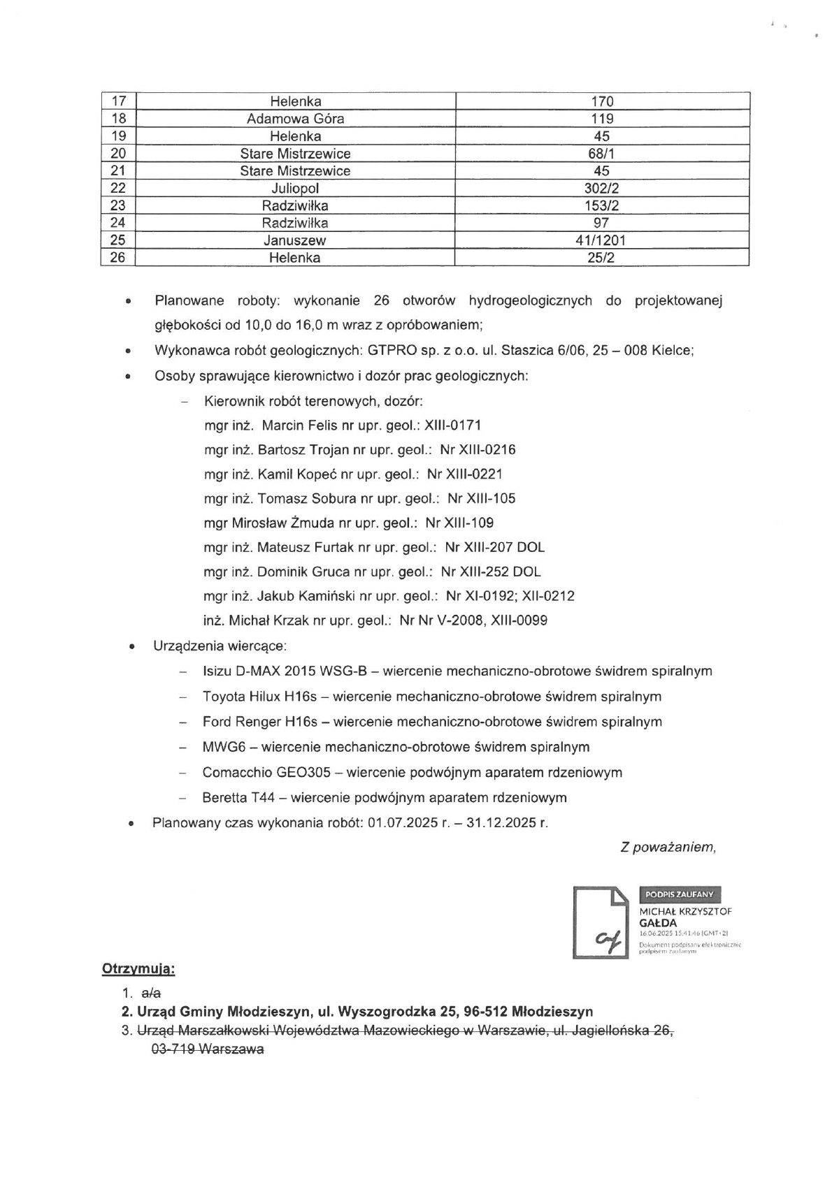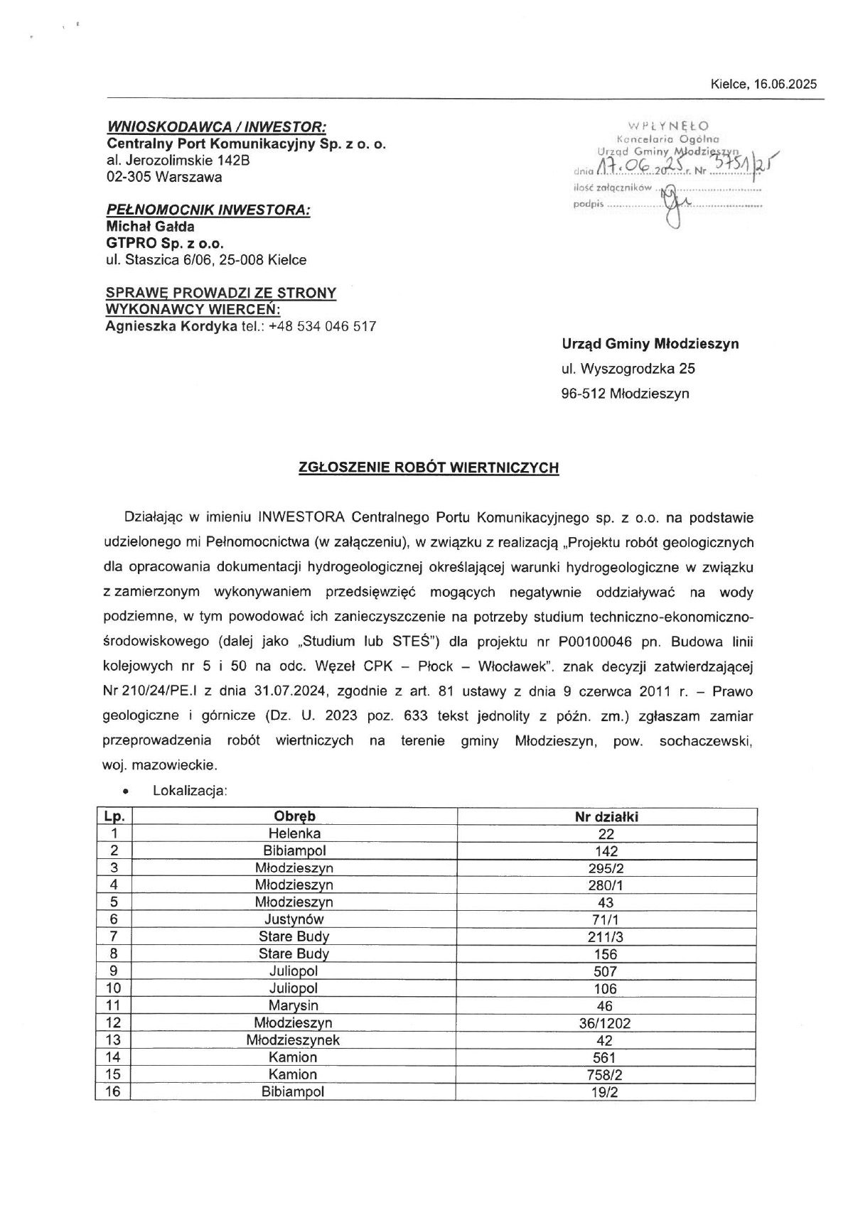 Informujemy, że do Urzędu Gminy Młodzieszyn w dniu 17 czerwca 2025 r. wpłynęło zgłoszenie robót wiertniczych, które będą wykonywane w dniach od 1 lipca 2025 r. do 31 grudnia 2025 r. na obszarze Gminy Młodzieszyn w związku z planowaną inwestycją „Budowa linii kolejowych nr 5 i 50 na odc. węzeł CPK–Płock–Włocławek”