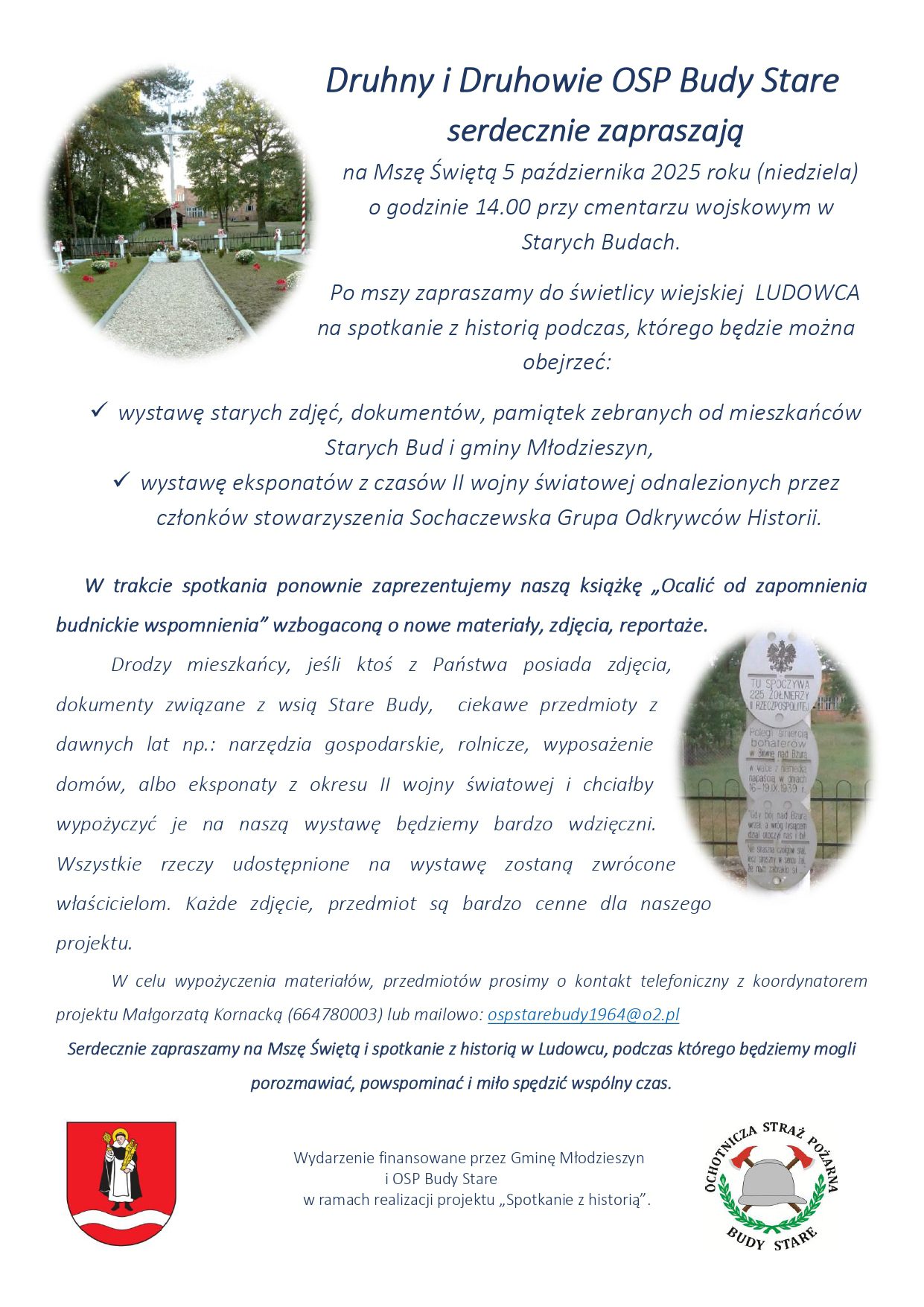 Druhny i Druhowie OSP Budy Stare serdecznie zapraszają na Mszę Świętą i spotkanie w „Ludowcu” 5 października 2025 roku (niedziela) o godzinie 14.00 przy cmentarzu wojskowym w Starych Budach.