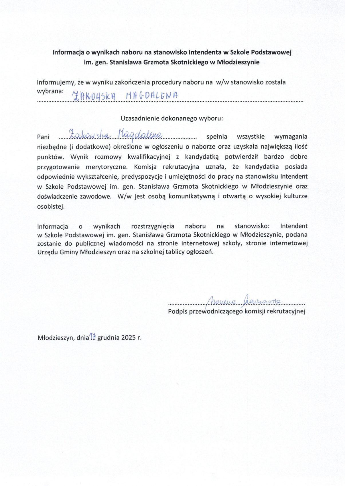 INFORMACJA O WYNIKACH NABORU