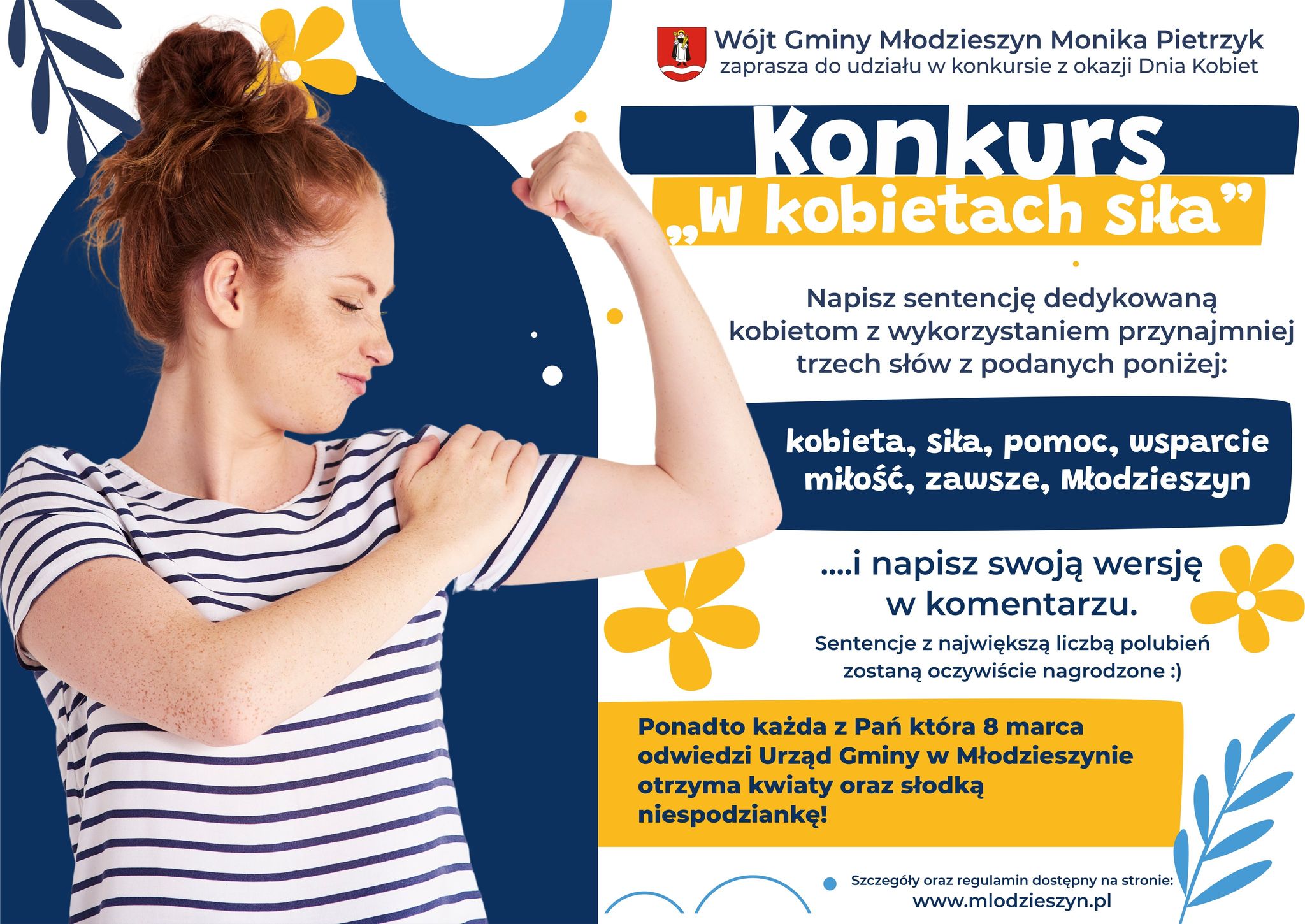 Z okazji zbliżającego się Dnia Kobiet, Wójt Gminy Młodzieszyn Monika Pietrzyk zaprasza mieszkańców do udziału w konkursie „W kobietach siła„. Napisz w komenta...