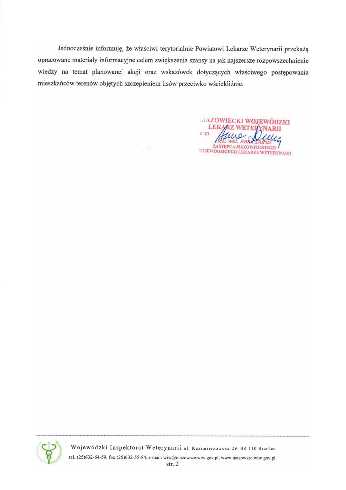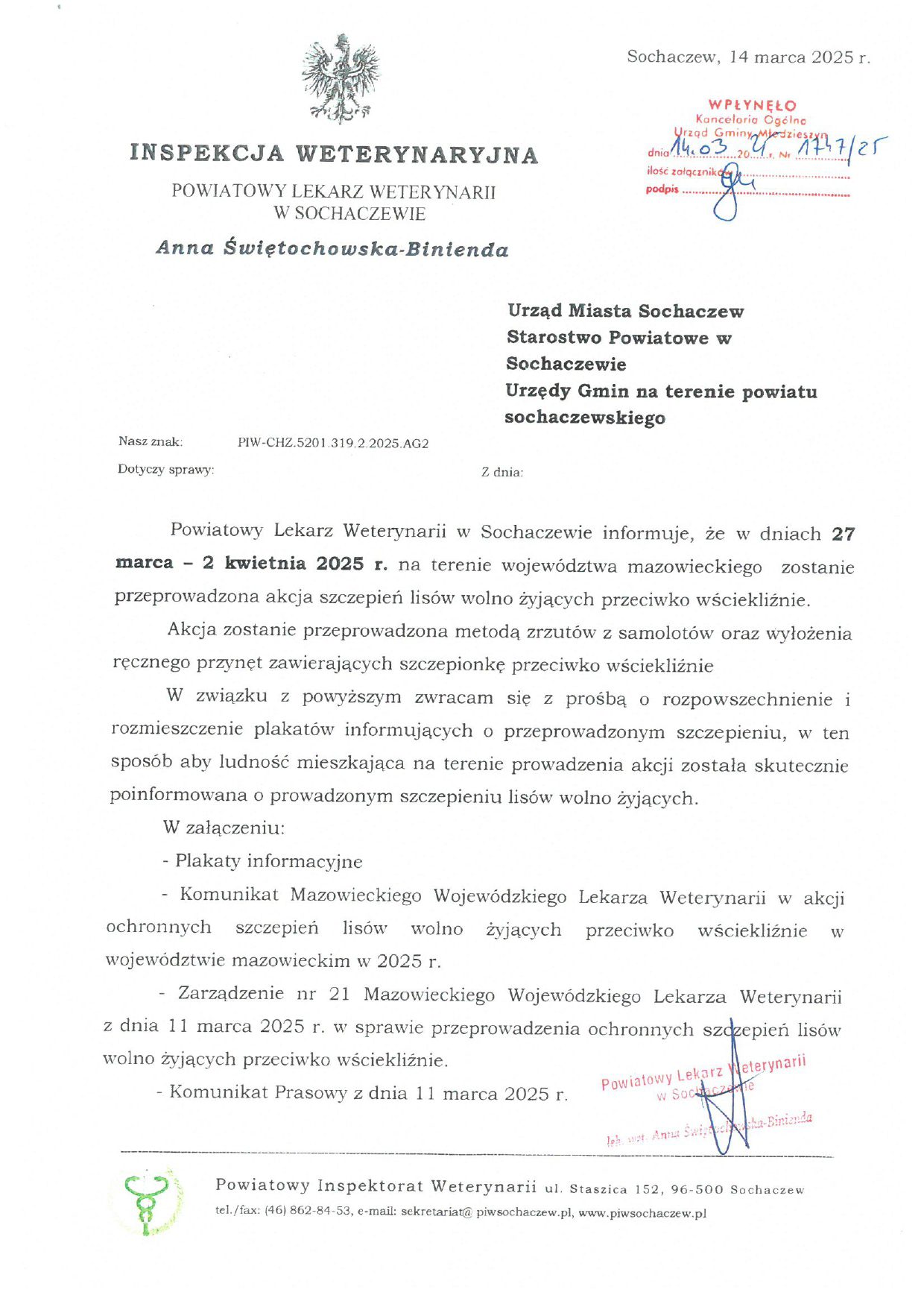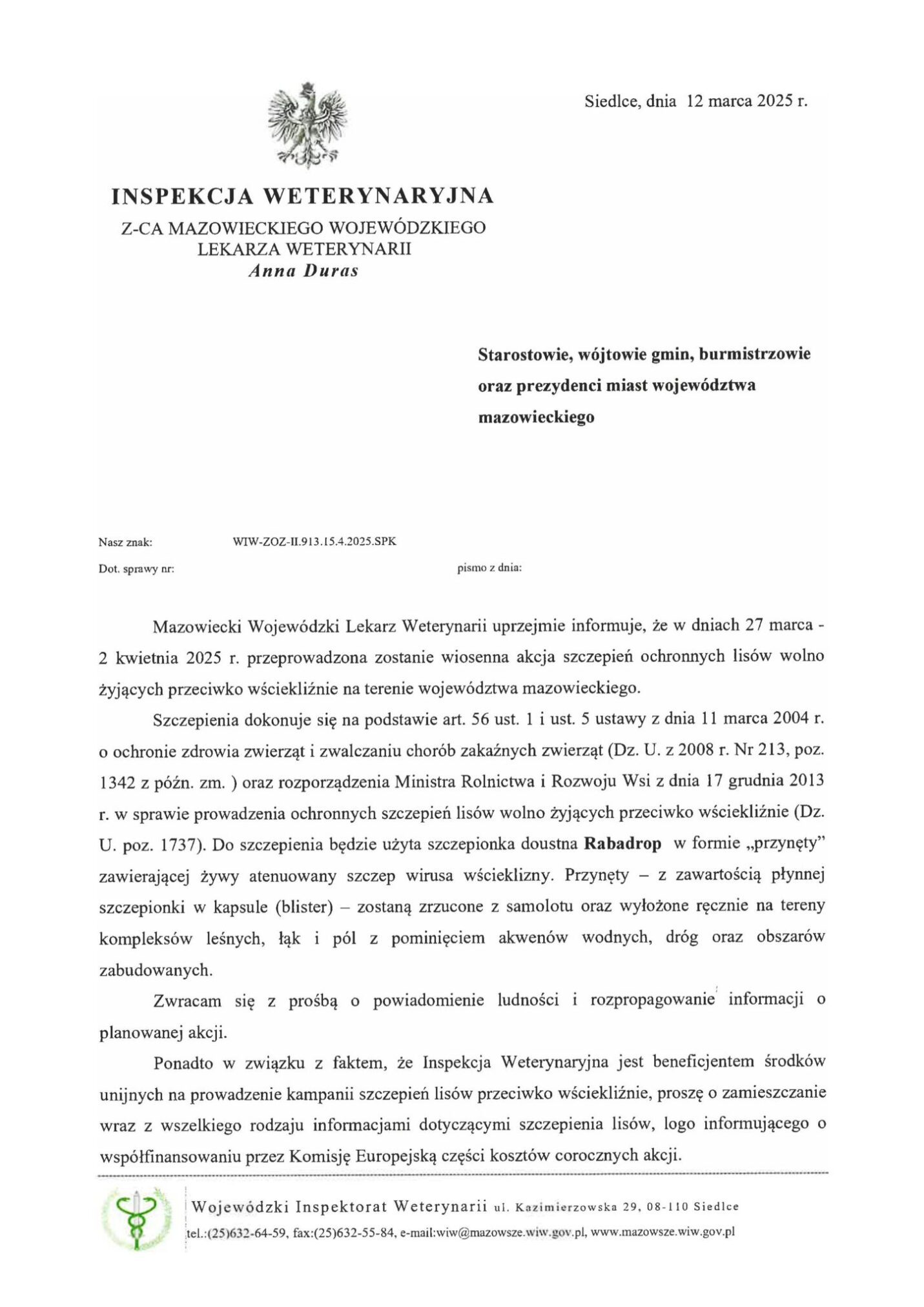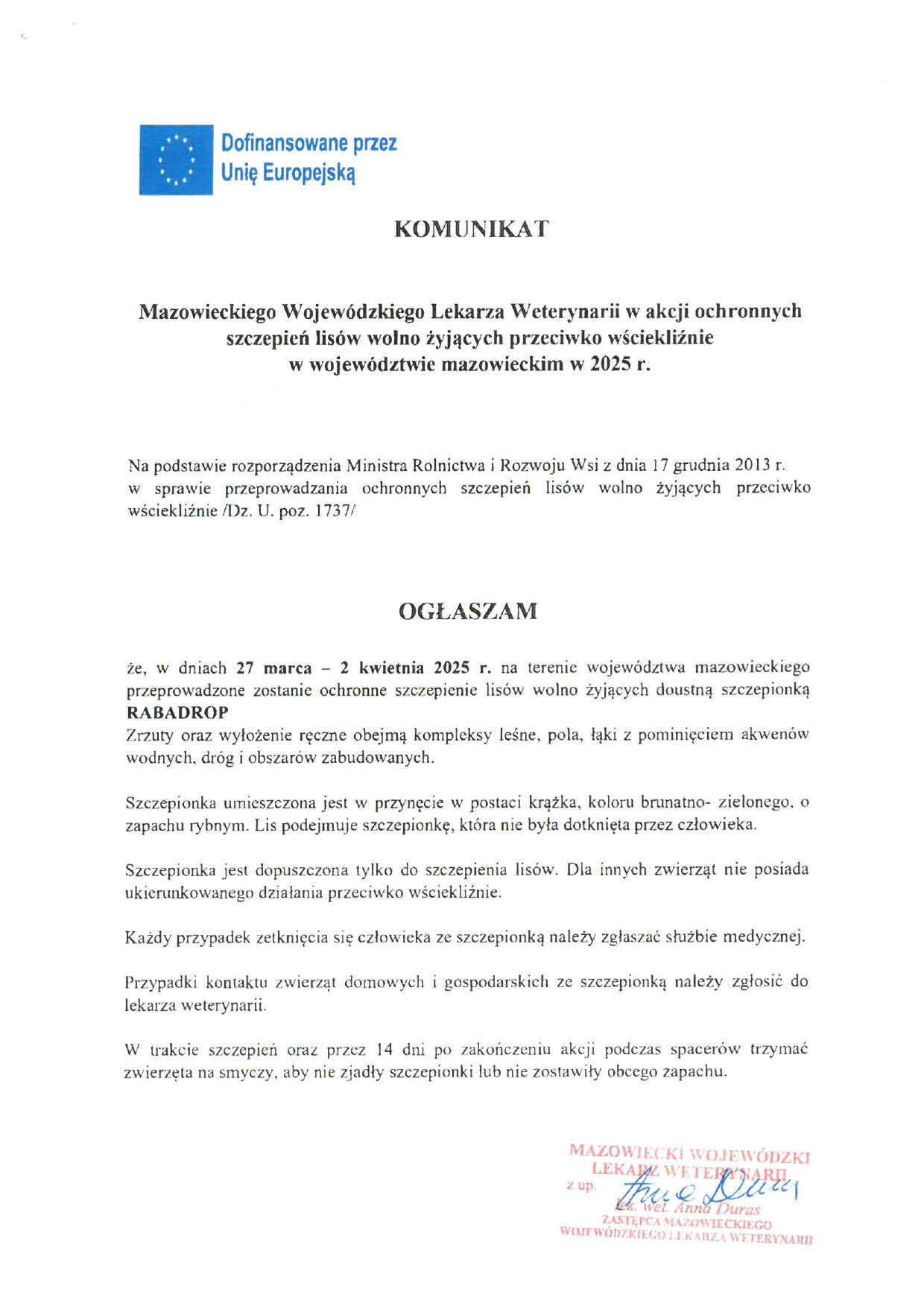 Szanowni Państwo, w związku z informacją przekazaną przez Wojewodę Mazowieckiego oraz Powiatowego Lekarza Weterynarii w Sochaczewie informujemy, że w dniach 27 marca – 2 kwietnia 2025 r. na terenie województwa mazowieckiego przeprowadzone zostanie ochronne szczepienie lisów wolnożyjących doustną szczepionką metodą zrzutów z samolotów i wyłożenia ręcznego przynęt zawierających szczepionkę przeciwko wściekliźnie.