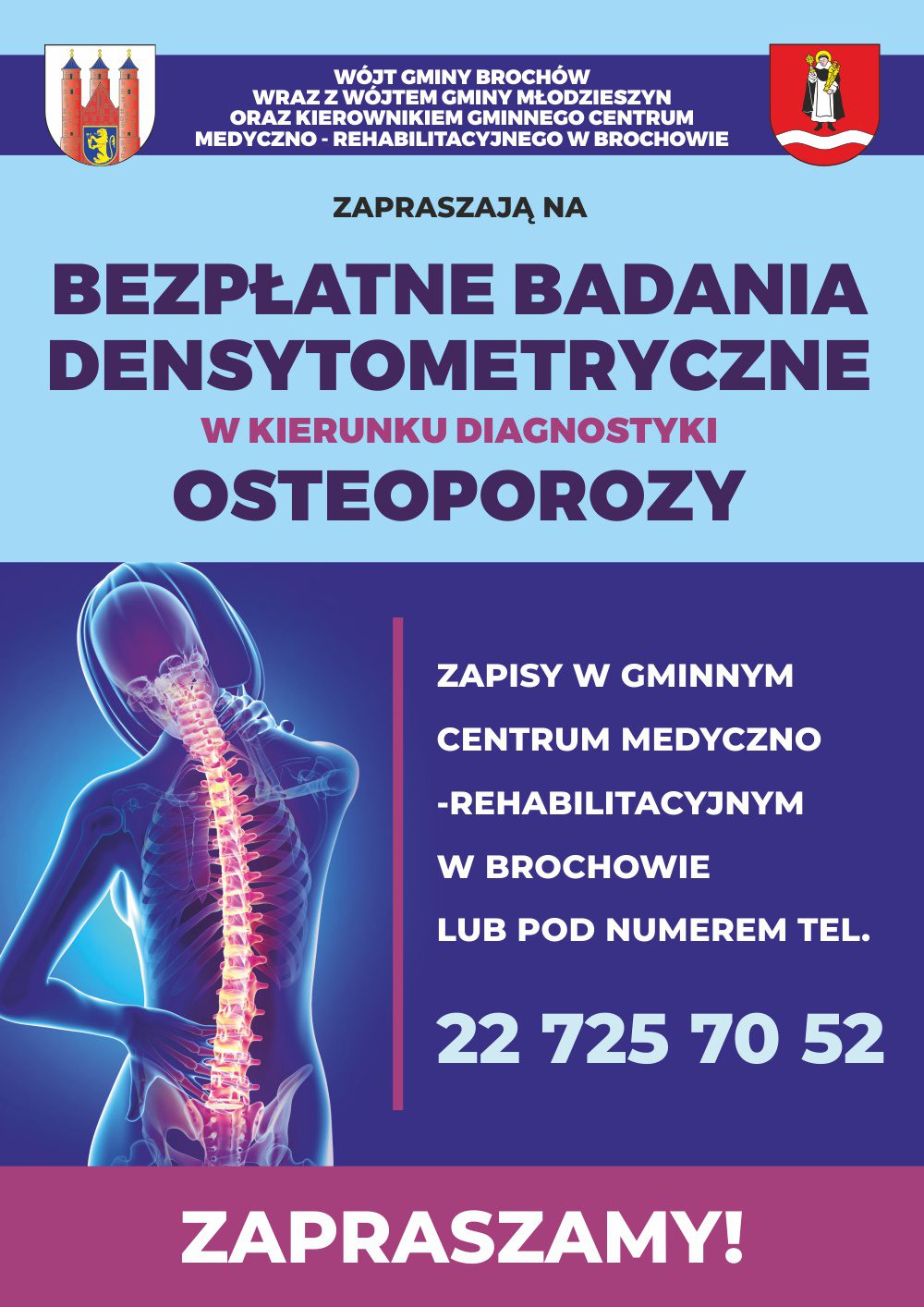 Wójt Gminy Młodzieszyn Monika Pietrzyk wspólnie z Wójtem Gminy Brochów Piotrem Szymańskim zapraszają mieszkańców gminy Młodzieszyn do zapisów na bezpłatne badania densytometryczne w kierunku diagnostyki osteoporozy. Osteoporoza to choroba, która może prowadzić do poważnych problemów zdrowotnych, dlatego tak ważne jest wczesne wykrycie i podjęcie odpowiednich działań.