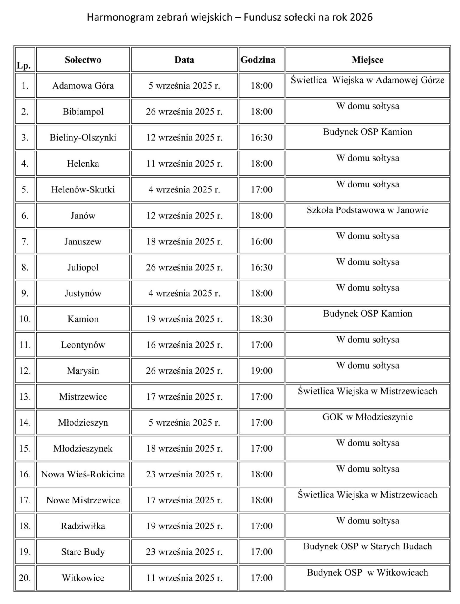 Informujemy, że we wrześniu 2025 roku w poszczególnych sołectwach odbędą się zebrania wiejskie, podczas których mieszkańcy zdecydują o rozdysponowaniu funduszu sołeckiego na rok 2026.
